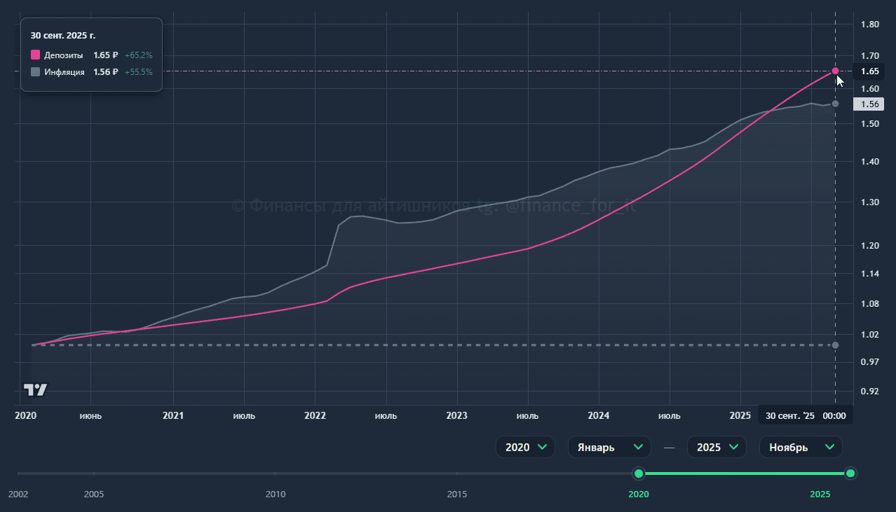 С января 2020 года депозиты не просто догоняют, а обгоняют инфляцию. При текущей ключевой ставке ЦБ 16.5% и ставках по депозитам 13-18% годовых вы получаете реальную положительную доходность.