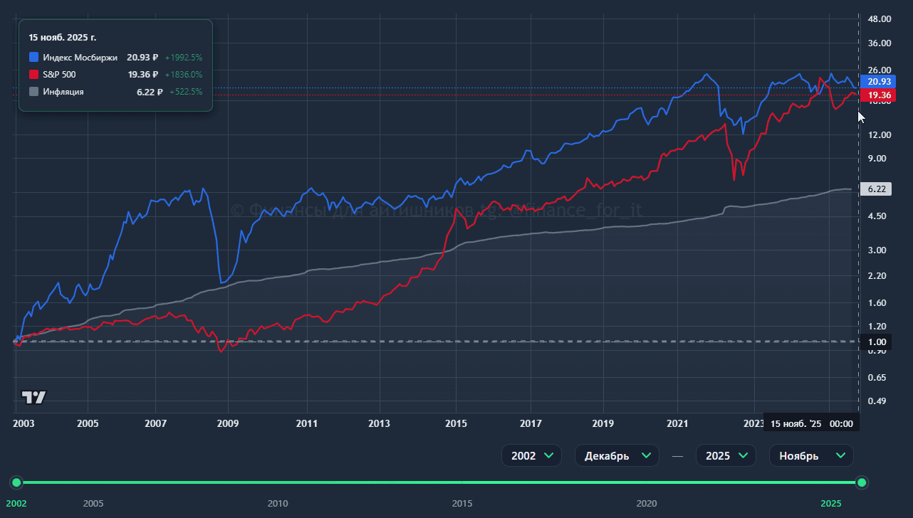 Рубль, вложенный в индекс Мосбиржи в 2003 году, вырос в 21 раз. Рубль, вложенный в S&P 500, вырос в 19.3 раза.