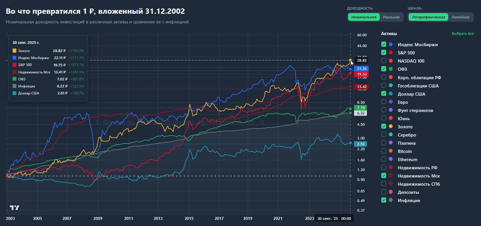 На графике она отображается по умолчанию, и это не случайно. Линия инфляции — это граница между «заработал» и «потерял». Всё, что ниже неё — убыток, даже если цифры зелёные. Понаблюдайте, как она неумолимо ползёт вверх год за годом, и какие активы остаются выше этой черты.